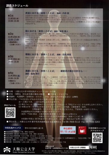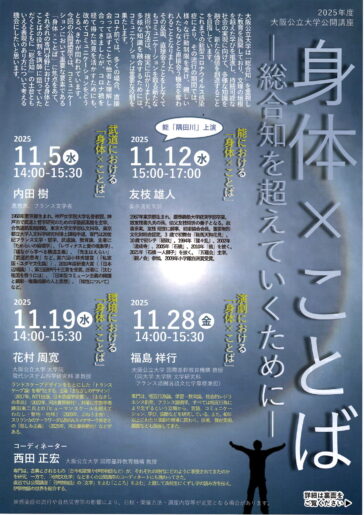 NEW! 2025年11月12日(水) 15:00(14:30開場) 大阪公立大学 中百舌鳥キャンパスUホール白鷺 身体×ことばー総合知ーを超えていくためにー 友枝雄人「隅田川」 2025年度大阪公立大学公開講座の一環で「隅田川」を勤めさせていただきます。会場は大阪公立大学 中百舌鳥キャンパスUホール白鷺です。能における「身体×ことば」をテーマに西田正宏教授の解説とともにお楽しみください。 友枝雄人 身体×ことばー総合知ーを超えていくためにー 解説 西田正宏 能「隅田川」 シテ 友枝雄人 於 大阪公立大学 中百舌鳥キャンパスUホール白鷺 2025年11月12日(水) 15:00(14:30開場) 受講料(全4回)4,000円 学生は無料(大阪公立大学生以外も可) チケット発売・申込開始 申込受付中 チケット販売サイトへ 大阪公立大学 生涯学習・公開講座ホームページ 申込締切10/13 申込はWEBもしくは往復はがきとなります。