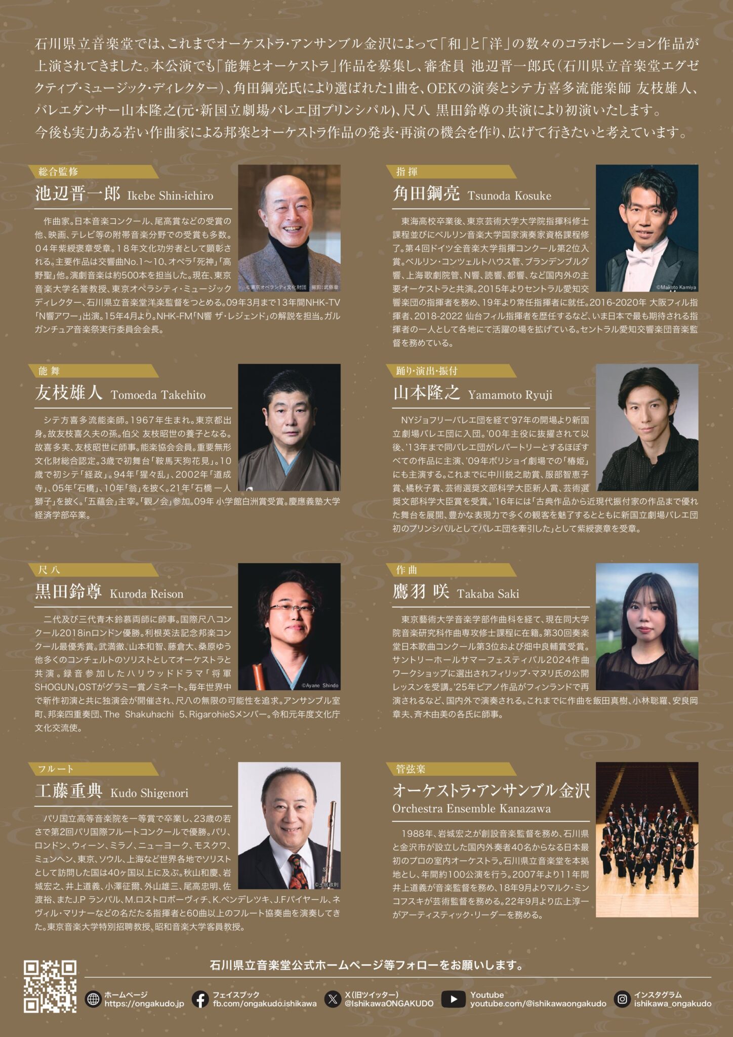 NEW! 2026年2月11日(水・祝) 14:00開演(13:15開場) 石川県立音楽堂コンサートホール 和洋の響Ⅵ 友枝雄人「桃花の翳の花筏Ⅱ」 石川県立音楽堂コンサートホールでの「和洋の響Ⅵ」に能舞で出演となりました。 「能舞とオーケストラ」作品を公募し、優秀作品に選ばれた鷹羽咲様作曲の「桃花の翳の花筏Ⅱ」をバレエダンサー山本隆之氏と共演させていただきます。素晴らしいコンサートホールでの舞台、演奏とともに舞もお楽しみください。 和洋の響Ⅵ 指揮 角田鋼亮 踊り・演出 山本隆之 フルート 工藤重典 尺八 黒田鈴尊 能舞 友枝雄人 管弦楽 オーケストラアンサンブル金沢 監修 池辺晋一郎 作曲 鷹羽咲 於 石川県立音楽堂コンサートホール 2026年2月11日(水・祝) 14:00開演(13:15開場) S席 6,000円 A席 4,000円 B席 2,500円 チケット発売・申込開始 発売中 チケット販売サイトへ 石川県立音楽堂チケットボックス